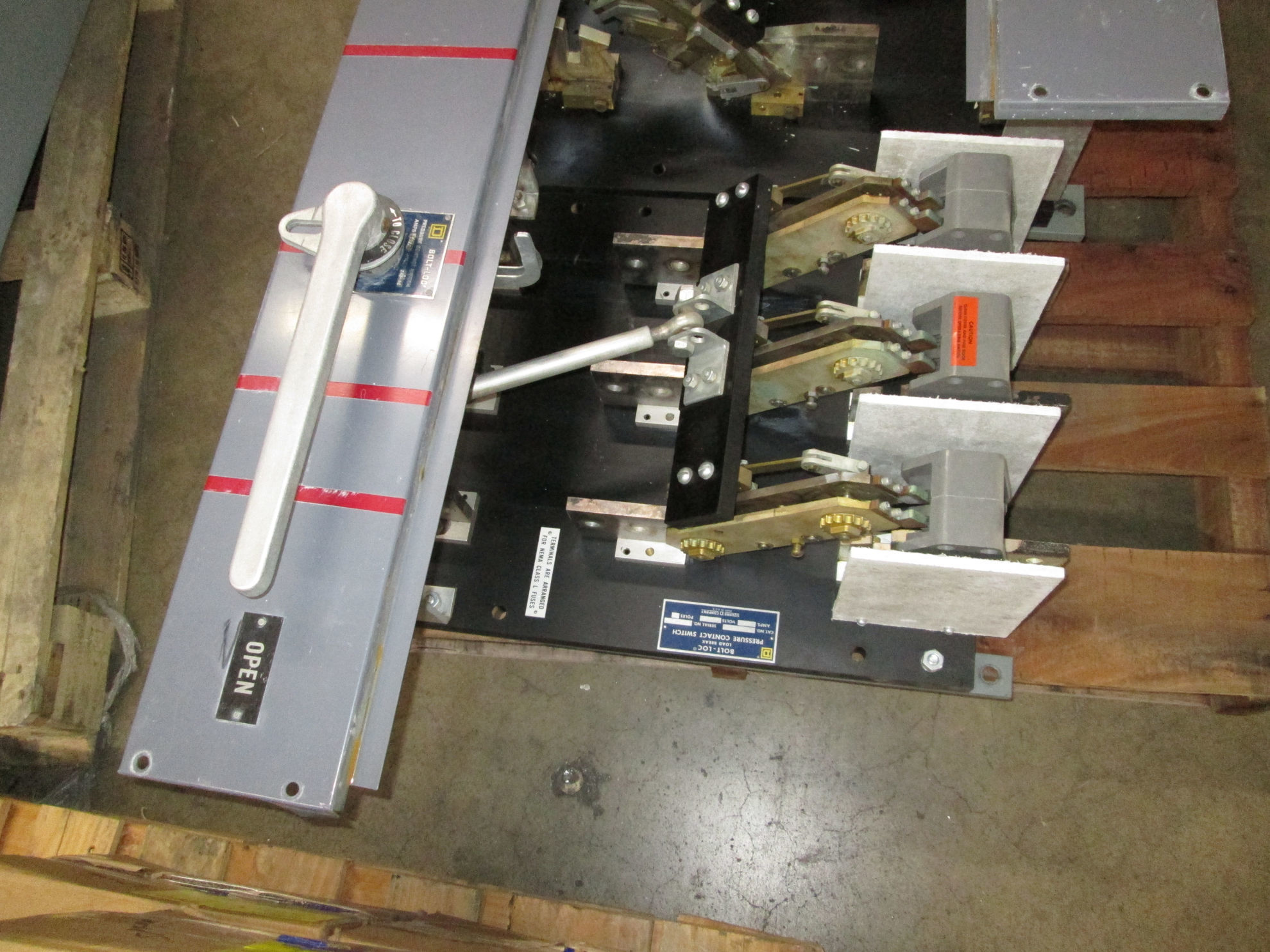 Square D BL-32120-0 Bolt-Loc load break pressure contact switch: 1200 amp, 240 volt, 3 pole, inverted black back plate. Sold used electrically OK. Fuses sold separately.