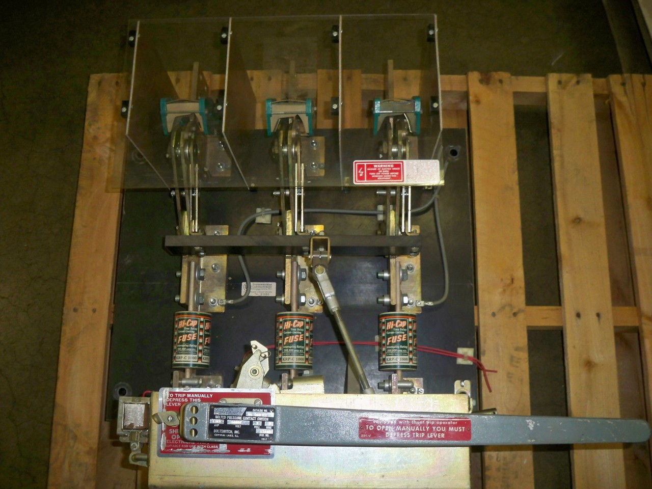 Boltswitch VL368-ST Pressure Contact Switch; 1200 amp, 600 volt, 3 pole, black back plate, shunt trip. Sold used electrically OK. Fuses sold separately.